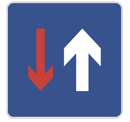 表示车辆在会车时享有优先通行权利,对向来车方向为红色箭头,优先行进方向为白色箭头。