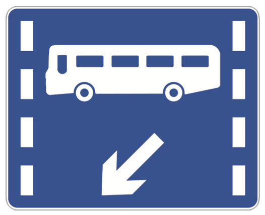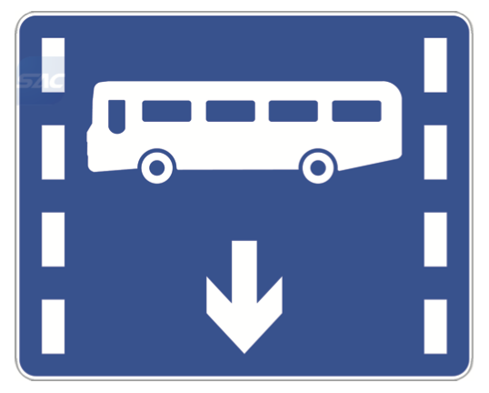 表示该车道仅供公交车辆、通勤班车等大型载客汽车通行,无“公交”两字,表示该车道公交车辆和通勤班车通行。 公交专用车道标志设置在车道正上方时,向下的箭头可以省略;在标志无法正对车道时,可调整箭头方向,指向车道。