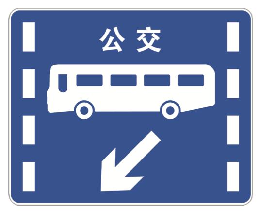 表示该车道仅供公交车辆、通勤班车等大型载客汽车通行,有“公交”两字,表示该车道仅供公交车辆通行。公交专用车道标志设置在车道正上方时,向下的箭头可以省略;在标志无法正对车道时,可调整箭头方向,指向车道。