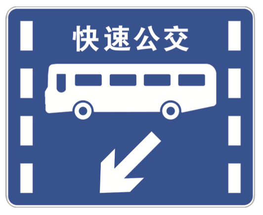 表示该车道仅供快速公交车辆通行,快速公交系统专用车道标志设置在车道正上方时,向下的箭头可以省略;在标志无法正对车道时 ,可调整箭头方向 ,指向车道。